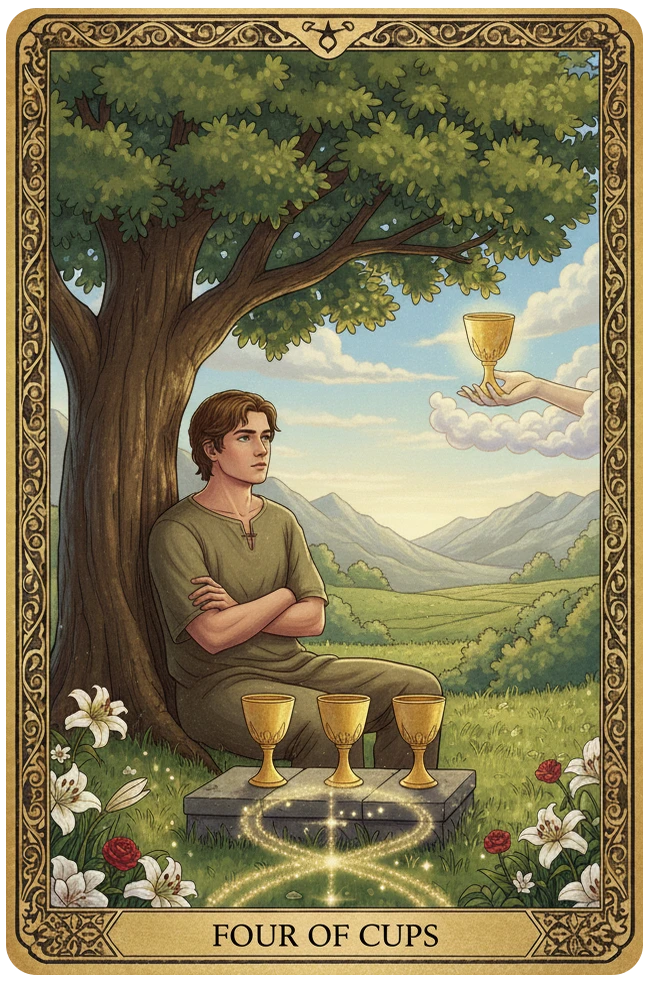 Апатия приходит тихо, как туман. Всё есть, всё на месте, но ничто не радует. Четвёртая чаша висит в воздухе, но зачем тянуться — ведь и в ней, наверное, то же самое.