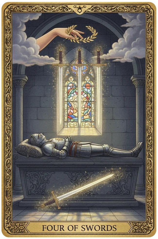 Отступление как стратегия, покой как необходимость. Три меча на стене, один под телом — битва отложена, не отменена. Молчание лечит лучше слов, пустота — лучше суеты.