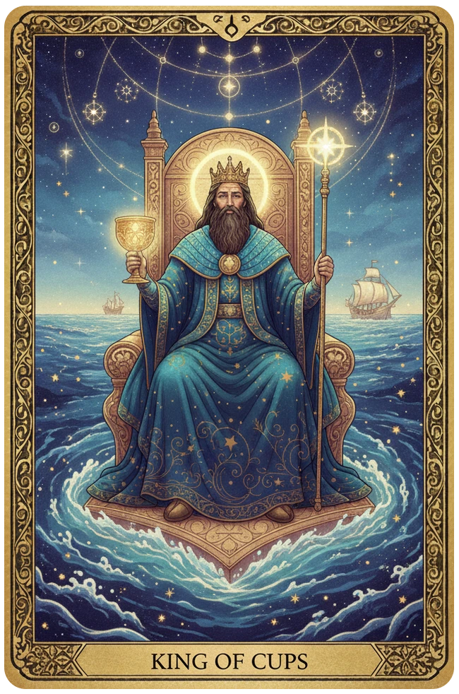 Эмоциональная зрелость, спокойствие в шторм. Он не подавляет чувства, но и не даёт им захлестнуть. Держит чашу уверенно — знает, что внутри, и не боится.